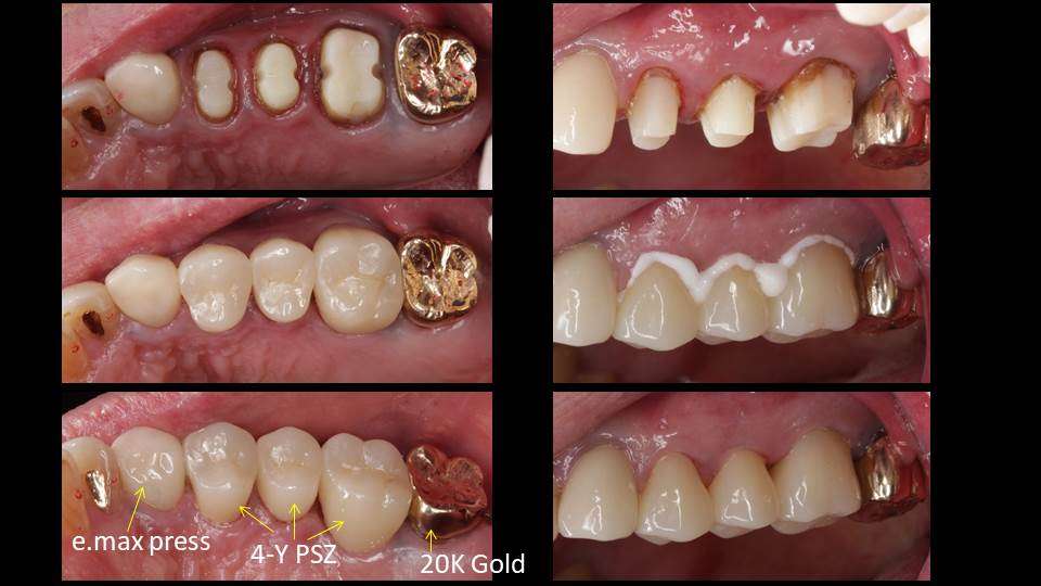 写真の症例では、3番(犬歯)に「二ケイ酸リチウムガラスセラミックス」を主成分とする Ivoclar社の e.max pressを、4,5,6番に「ジルコニアセラミックス(4-Y PSZ)」を、7番に「金合金」製のクラウンで補綴治療をしている治療過程を供覧しています。