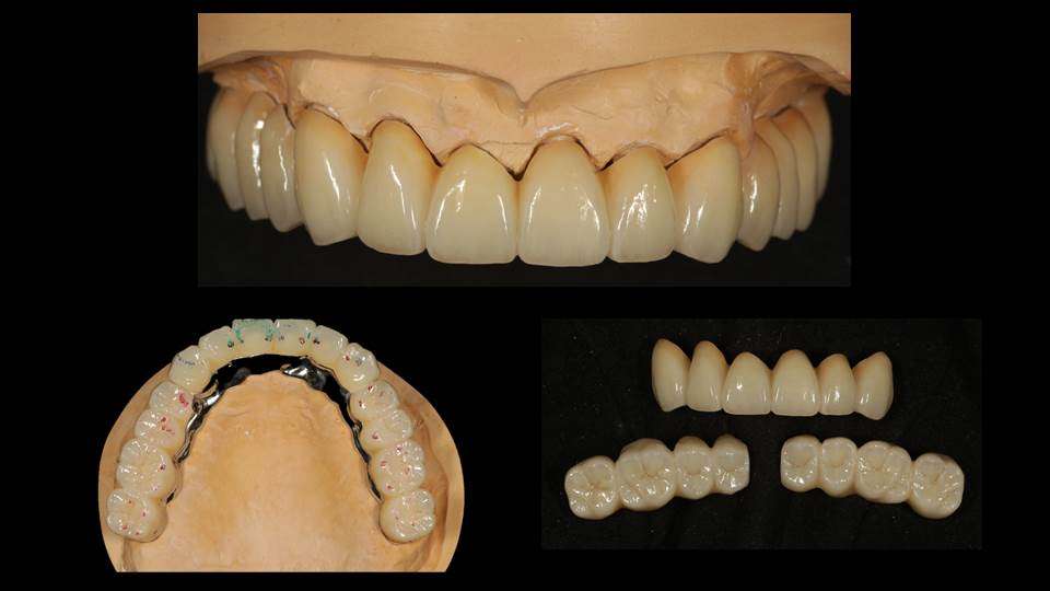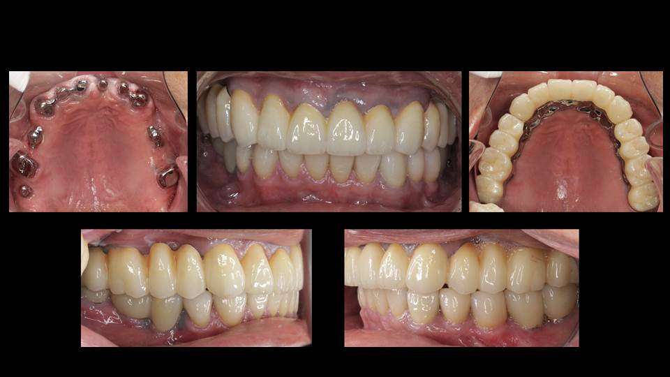 写真は、虫歯や歯周病で歯がボロボロ・グラグラになってしまっても、お仕事も忙しく歯医者に長年通院できず、やっとの思いで当院に受診された患者様です。残念ながら、歯ぎしりや食いしばりで歯が割れている部分や、むし歯が大きすぎてボロボロで残せない歯は抜歯をして、部分的にインプラントを埋入して、テレスコープ義歯とジルコニア セラミックスを用いる最新式の入れ歯の専門治療を計画し、審美性と咀嚼機能の改善を図ることにしました。