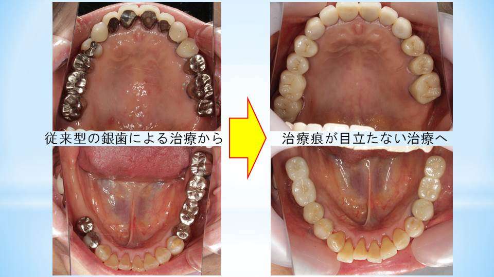 流山のグランツ歯科クリニックでは「銀歯ばっかりのお口の中」を白い歯で治療をします。