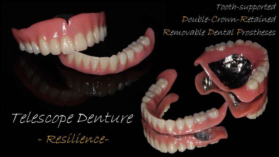 写真は、歯周病で長く伸びてしまった歯ばかりになってしまった患者様のテレスコープ義歯です。「はめ込み式の入れ歯」である「レジリエンツ テレスコープ」で治療させて頂きました。バネ式の入れ歯ではありませんので、一度得られた歯並び、咬み合わせ、装着感には長期に渡って変化がありません。