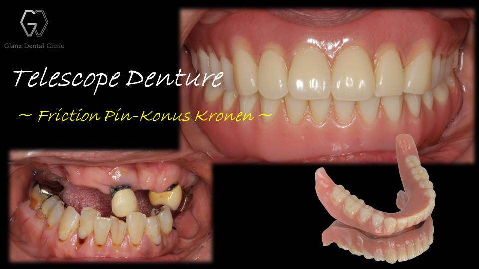 写真は、高齢の御両親の介護で自分の事は後回しになってしまい、むし歯と歯周炎が進行してボロボロな歯と入れ歯になってしまった患者様を治療した際のテレスコープ義歯です。上顎は健康保険適用のレジン床総義歯で、下顎には「茶筒式の入れ歯」に摩擦維持機構を設けた「フリクションピン コーヌス テレスコープ義歯」で治療させて頂きました。バネ式の入れ歯ではありませんので、一度得られた歯並び、咬み合わせ、装着感には長期に渡って変化がありません。