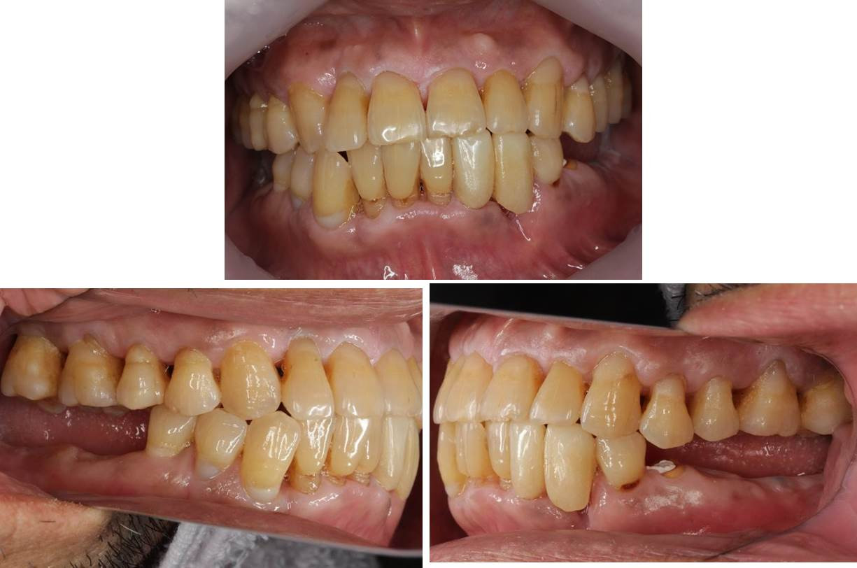 患者様は男性で齲蝕と歯周病を併発しており、下顎は奥歯を失っている状態でした。歯周病の治療と虫歯の治療を行ないつつ全顎的に介入する治療方針を立てました。持病のため外科処置が行なえない患者様も多く、今回の患者様もインプラント治療は受け入れられない状態でした。