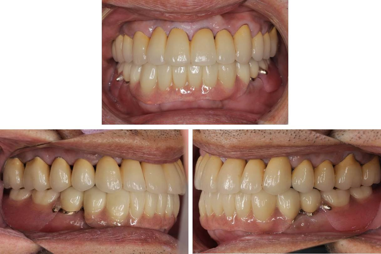 上の歯は「メタルボンド冠」という、金属にセラミックスを焼き付けた白い被せ物で、下の歯は「コーヌス テレスコープ」という義歯で治療しています。コーヌス テレスコープの維持機構は、茶筒の蓋と同じく、歯に取り付けた金属冠と入れ歯の内側に取り付けた金属冠が面と面で接することで、着脱が可能となります。つまり入れ歯の内側に接着剤や入れ歯安定剤は不要ですし、バネも使用しませんので、審美的にも好まれることが多いようです。取り外せるメリットを活かし、残っている歯の清掃性も向上します。万が一、支える歯を失っても、義歯の形を変えることなく即日修理が可能であるため、一度得た美しい歯並びを長く綺麗に保つことができるというのが利点です。