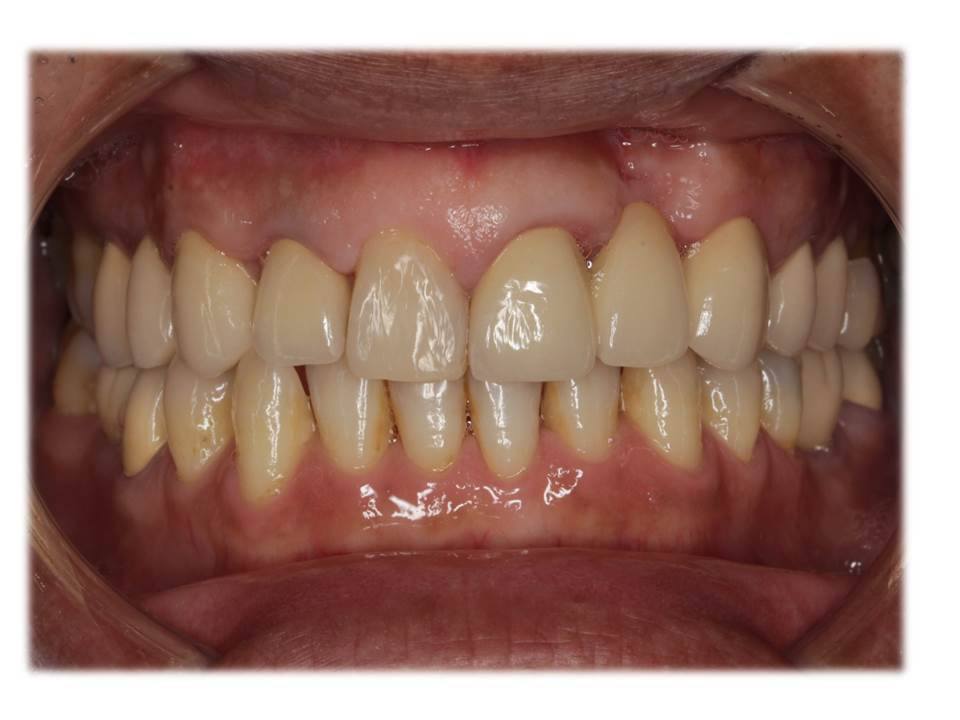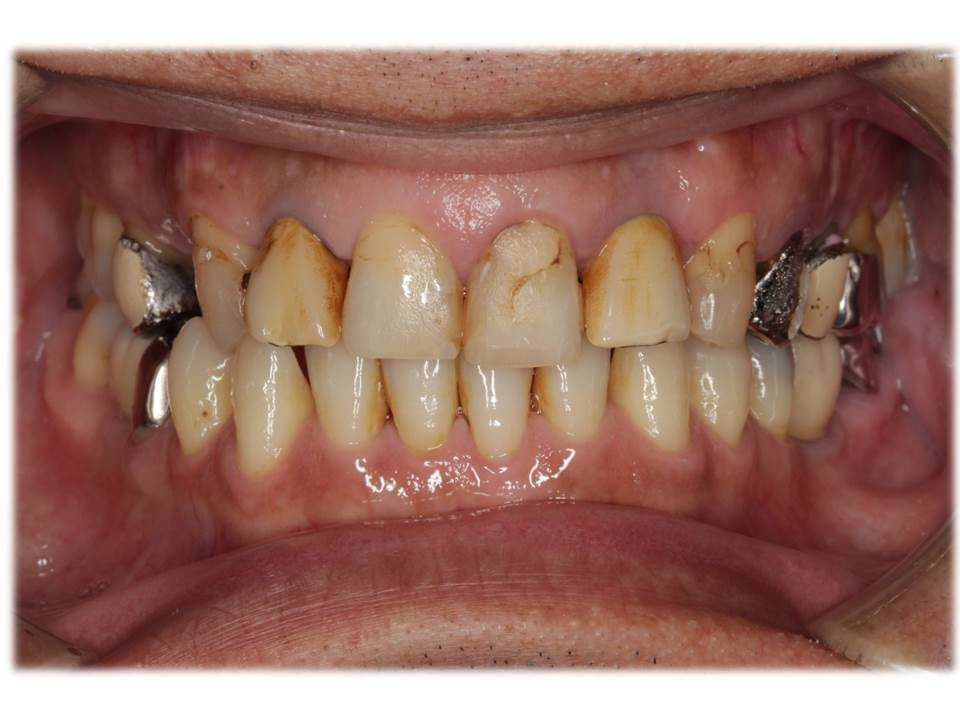 画像の患者様も、これまでに保険適用の治療を繰り返し受け続け、歯は欠損し、むし歯が発生し、銀歯が目立つお口の中になっていました。「齲蝕および歯牙欠損に伴う審美・咀嚼障害」と診断されます。