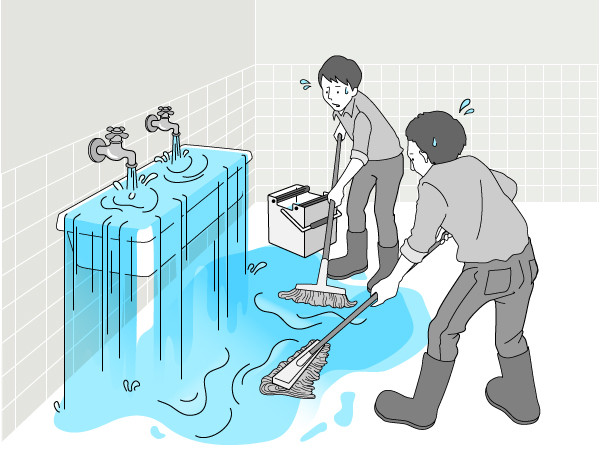 画像は、蛇口を締めずに床面に流れ出る水をモップや雑巾で拭いている様子です。旧時代の歯科治療に形容されることが多い画像なのですが、根源を断たずして出現している症状にのみアプローチをする様子の比喩です。元を断たなくては意味がありません。