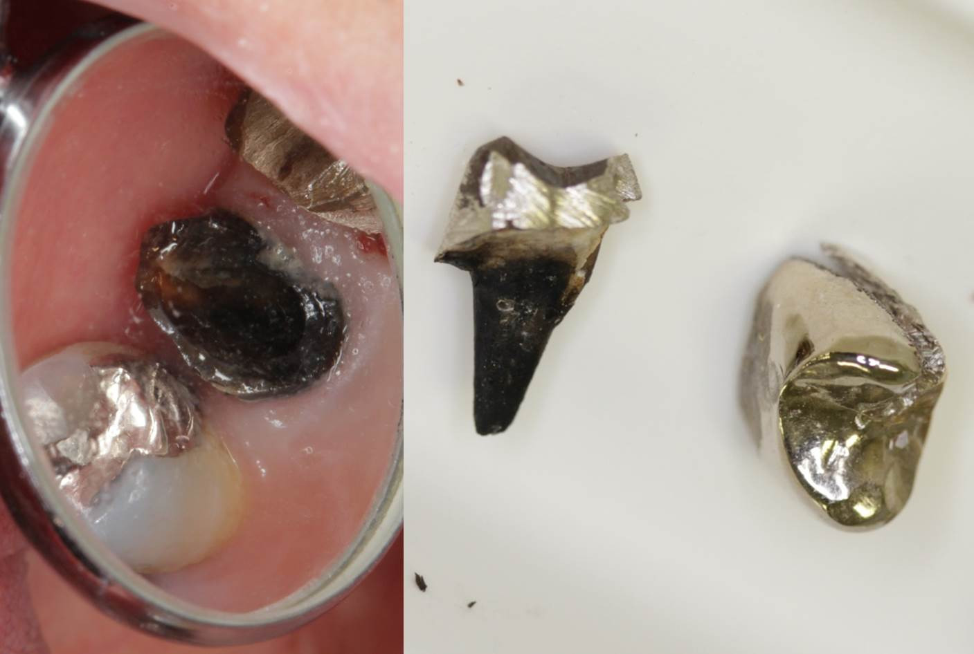 銀歯の下で齲蝕(ウショク:むし歯の意味)に罹患していることが、定期歯科検診で見つかるケースが非常に多いと感じます。画像はごく一般的な銀歯の被せ物、金属の土台を外した写真です。左側が歯の内部で、右側が装着していた金属ですが、むし歯で黒くなり、かなり金属も腐食しているのがお分かりでしょうか?