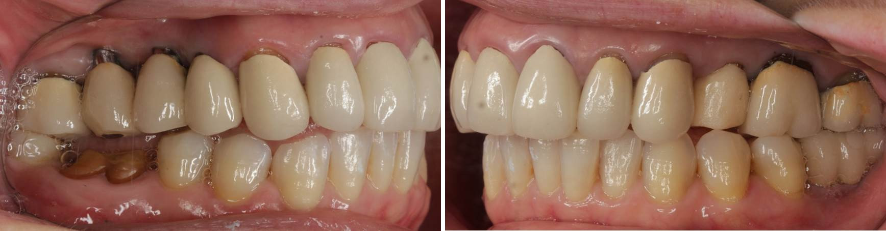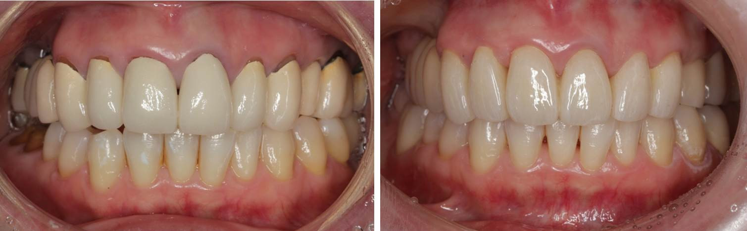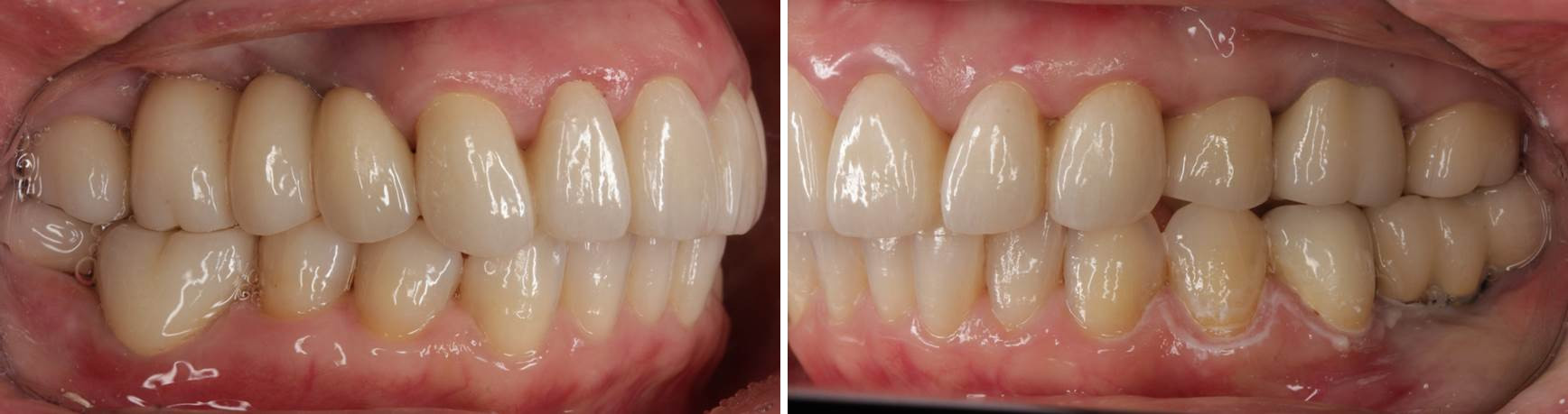 画像は術後の記録です。咬合平面が揃い、横一線に歯列が構築され、歯並び・咬み合わせの面で調和が図られています。最新のセラミックス材料「高透光性ジルコニア」による審美補綴治療の一例です。被せ物の縁もしっかりと合わせています。