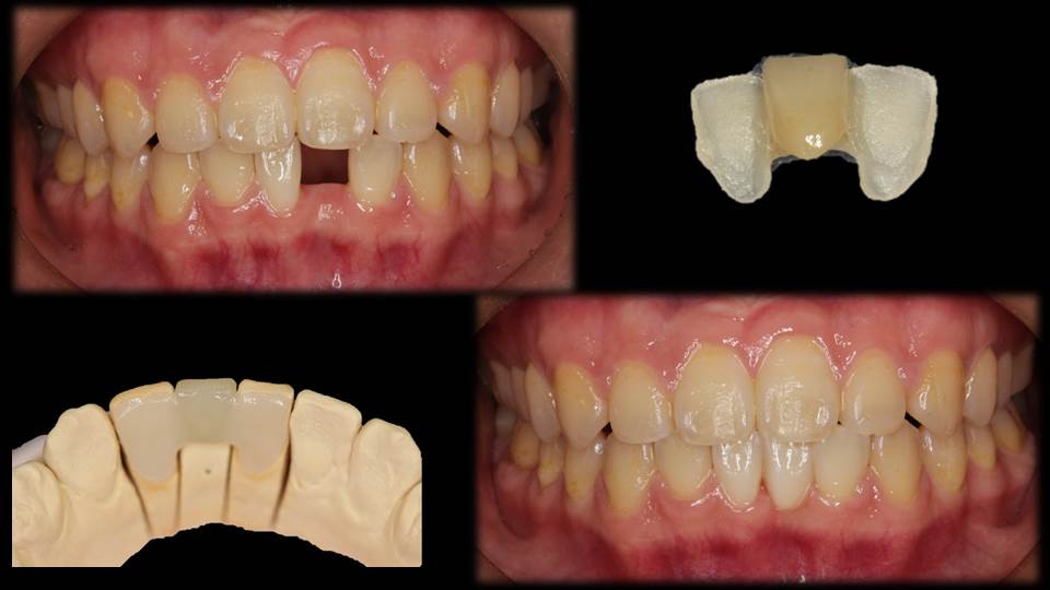 接着ブリッジという歯の裏側(舌側面)のみを利用する、非切削の、又は限りなく切削量の少ないブリッジの方法があります。本症例ではe.max? press(ivoclar vivadent社)という二ケイ酸リチウムガラスセラミックスを用いた接着ブリッジを装着しました。
