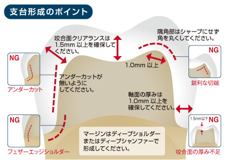 形成と呼ばれる削って形を整える技術や、被せ物の材料の選択、確立された接着システム、咬み合わせの診断能力が治療の成否には非常に重要です。被せ物の治療の検討の際には是非、グランツ歯科クリニックまでご相談ください。補綴専門医・咬合認定医が相談させていただきます。