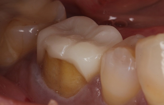 画像のように、材料として適切な厚みを確保できていなければ、欠けてしまうことがあります。また、欠けた欠片や歯の面を見てみると、接着剤が残っていないことが確認されました。本症例では、適切な厚みが確保されていないままに被せ物が製作され、かつ接着剤が早期に脱落してしまったために破損してしまった、と考えられます。