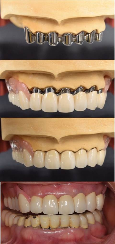 グランツ歯科クリニックは2019年10月7日に開院致しましたが、11月頃から治療を開始し、2020年3月初旬に「テレスコープシステム」での治療が完了した患者様の模型上及び、お口の中の様子です。右上3番~左上4番までの7歯残存の症例です。使用金属は「チタン合金」で、歯の白い部分には「ハイブリッドセラミックス」を前装して、歯の形と色合いを再現してあります。
