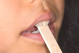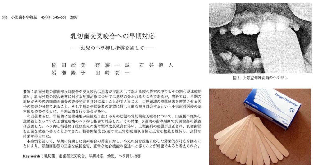 カップアイスを食べる時に使用する木製のヘラを用いて治療した、という報告です。反対になっている前歯を下の写真のように、3秒ずつ50回繰り返し、1日3セットを6か月程度続けて改善した臨床例に基づいた論文です。