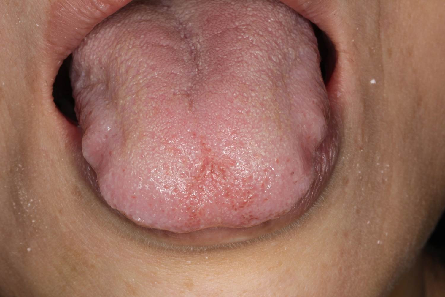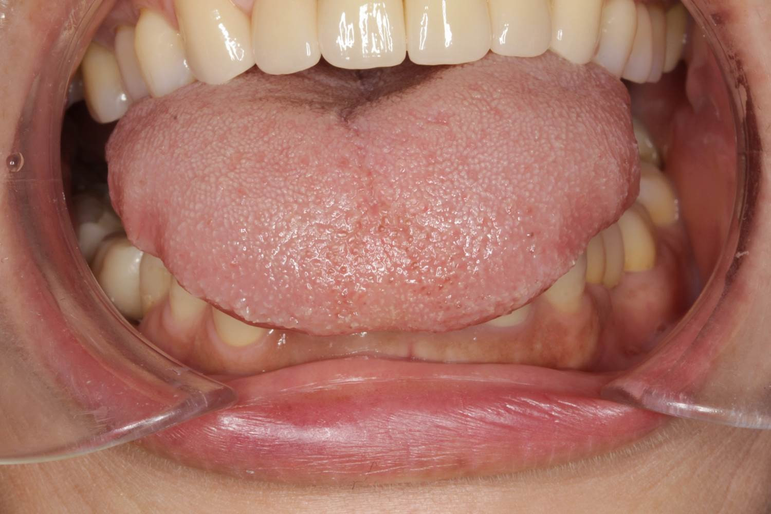 本症例では、上下の前歯に出来る僅かなスペースに、舌を緊張させて舌先を無意識のうちに隙間に押し込み、口腔内の乾燥を防いでいた、と予想致しました。通常は、リラックスした舌の場合、舌先部は上の前歯の裏側の歯茎にある切歯乳頭部に触れている状態で弛緩していることが望ましいとされています。緊張状態が続いていた為、舌の側面が歯奥に押し付けられて、舌痛の原因になっている可能性が高いと判断致しました。