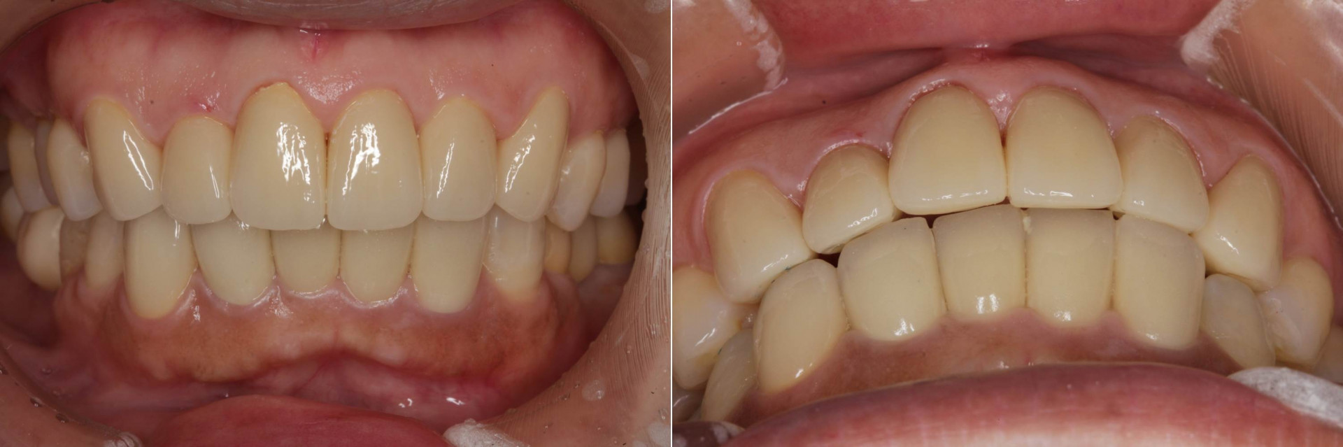 左の画像は正面観ですが、一見すると綺麗に治療されているように見えます。上下の前歯12本がセラミックスの被せ物で治療が施されているのですが、右の画像を見ると、咬合時(上下の歯を合わせた時)に、上下の前歯が嚙み合っておらず、僅かに隙間である状態です。