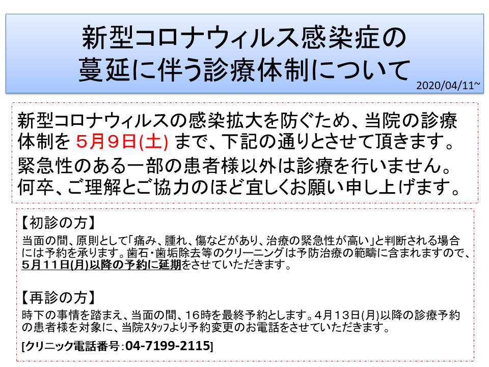 流山のグランツ歯科クリニックでは新型コロナウィルス感染症の蔓延防止のため診療体制を変更しております。 2020/04/11 流山のグランツ歯科クリニックでは新型コロナウィルス感染症の蔓延防止のため診療体制を変更しております。 診療時間の短縮、受診予約の延期をお願いさせていただいております。 当院グランツ歯科クリニックでは、昨年10月の開院以来、日常臨床から滅菌・消毒環境を整え、個別診察室での診療体制を完備しているため、衛生的な環境での治療が受けられることで信頼を得ております。 「安心・安全・清潔」を当たり前の診療理念として準備しておりますので、治療環境にご相談のある方は是非、グランツ歯科クリニックまでご連絡下さい。 アクセスはこちら