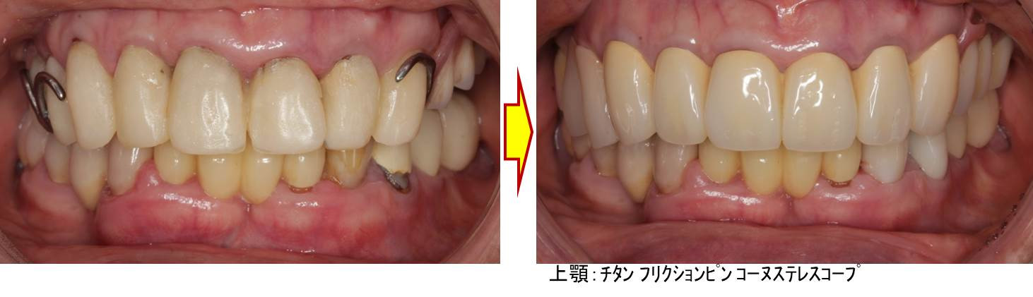 画像は、合わない入れ歯で長くお悩みでいらしゃった患者様の治療前後の写真です。他院にて健康保険適用のバネ式入れ歯を作製したものの、入れ歯の大きさの違和感とバネの存在で入れ歯をあまり入れていなかったようで、いわゆる「ポケットデンチャー」(ポケットの中にしまって使用していない入れ歯の意味)になっていました。残存歯に負担が掛かり、状態も悪くなってきたため、意を決して治療に臨んでいただける機会を得ました。見た目が良く、奥で咬んだ力を残っている歯に、前歯に加わった力が奥の歯茎に効率よく分散する機能的な入れ歯を設計しなくてはなりませんでした。