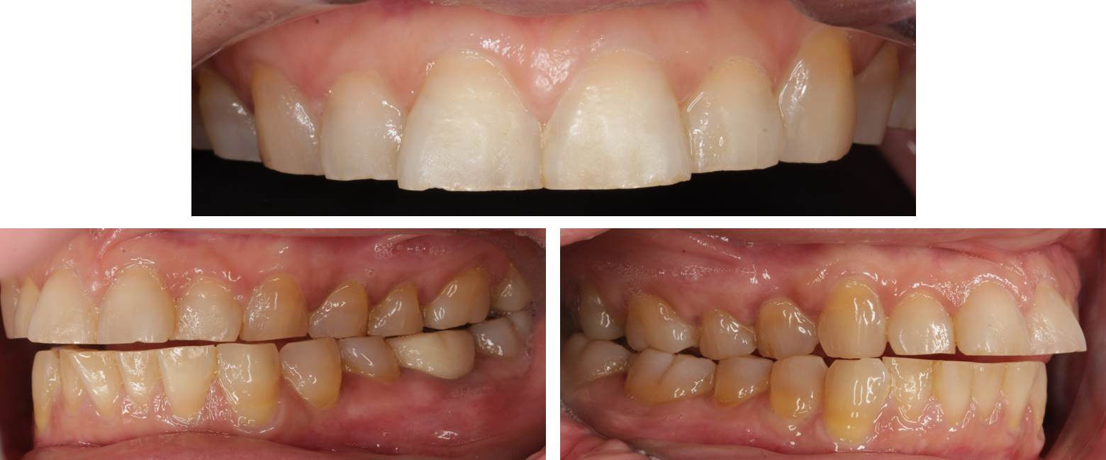 「歯ぎしり・くいしばりで歯が痛い」という相談が増えてきています。上の画像は、「歯ぎしり・くいしばり」が酷く、歯が加速度的に削れてきている患者様の口腔内の一例です。咬んだ時の力をストップさせる奥歯の摩耗が進むにつれて、前歯に掛かる負担が大きくなるため、対症療法的ではありますが、早期にハードタイプのマウスピース(ナイトガード)を装着する必要があります。