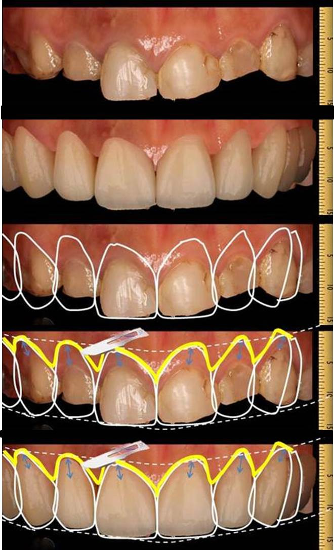 画像は「デジタルスマイルデザイン(Degital Smile Design; DSD)」システムの一例です。顔貌のどの位置に上の前歯の先端(上顎前歯切縁)をもってくるのか、歯の形や色さえも画像上でシミュレーションを行ない、治療計画を立案するものです。当院が得意とする全顎補綴治療において、大いに役立つ診断ツールの一つです。