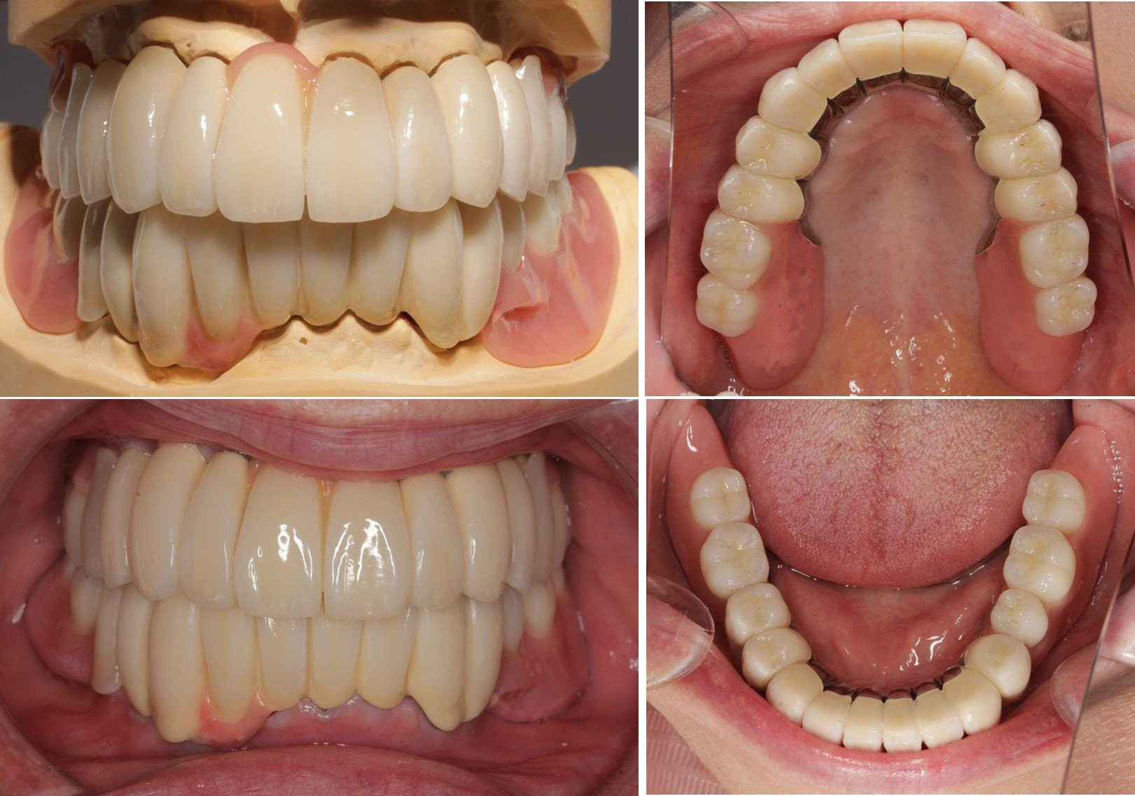 当院で2020年4月下旬に「チタンフリクションピン コーヌステレスコープ」での治療が完了した患者様の模型上及び、お口の中の様子です。使用金属は「チタン合金」で、歯の白い部分には「ハイブリッドセラミックス」を前装して、歯の形と色合いを再現してあります。