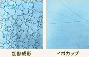 左は「従来の過熱成形法」、右が「イボカップ成形法」です。 加熱成形は顕微鏡で拡大すると、細かな気泡が多数見られ、間隙が目立ちます。それに比べて、イボカップ成形法では顕微鏡で大きく拡大しても、ほとんど気泡が認められず、樹脂が高密度に充填されて固められていることが確認できます。この違いが臭いの原因物質となる細菌付着の違いになるのです。