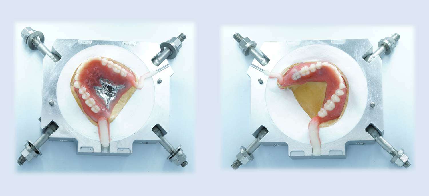 入れ歯に付く嫌な臭いの原因は何でしょうか?日常的に食べるものや、消化器疾患に起因する場合もあります。一方で、義歯の作製方法や材料にも影響を受けることも分かっています。従来の加熱成形法では義歯用プラスチック(レジン)の収縮が補正されないまま義歯が出来上がってしまいます。その為、変形や内部に肉眼で見えない細かい気泡がたくさん入った「多孔質のプラスチック」になってしまいます。上の写真は2種類の加熱加圧レジンを約300倍に拡大した画像です。