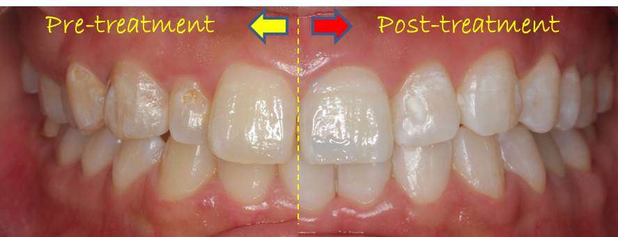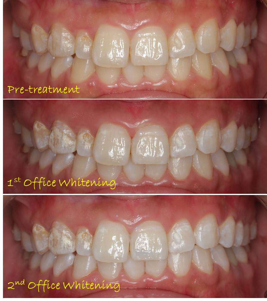 流山の歯科医院で「オフィス ホワイトニング」治療が対応可能な歯科医院です。 2021/09/23 流山の歯科医院で「オフィス ホワイトニング」により効果的に歯を白くする治療が受けられます。 削らずに歯を白くする唯一の方法です。 「削らずに歯を白くしたい」というご要望が多くなってきています。歯を削らずにご自身の歯を白くする唯一の方法は、「ホワイトニング」という治療方法です。自宅でマウスピースに薬液を入れて一日数時間を連続で数日の間装着することで歯を白くする「ホーム ホワイトニング」と、歯科医院にて専用の機械を用いて1.5時間程度かけて行なう「オフィス ホワイトニング」があります。一般的にはオフィスホワイトニングの方が美白(漂白)効果が大きく、評判が良いようです。 画像は上の段から術前・1回目・2回目の写真です。殆どの方が2回施術することで、目的の明るさや白さに変わるようです。 正中で画像を二分して、歯の色の変化を見やすくしています。 「削らずに歯を白くしたい」という方は是非、グランツ歯科クリニックまでご相談ください。 アクセスはこちら