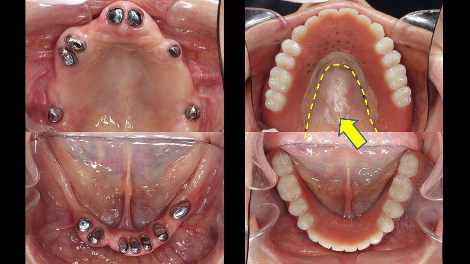 写真は、歯周病で長く伸びてしまった歯をどうしても抜きたくなくて当院に受診された患者様のテレスコープ義歯です。御自身の歯を抜かない代わりに、インプラント2本を支えとして追加した「はめ込み式の入れ歯」である「フリクションピン コーヌステレスコープ」で治療させて頂きました。バネ式の入れ歯ではありませんので、一度得られた歯並び、咬み合わせ、装着感には変化がありません。